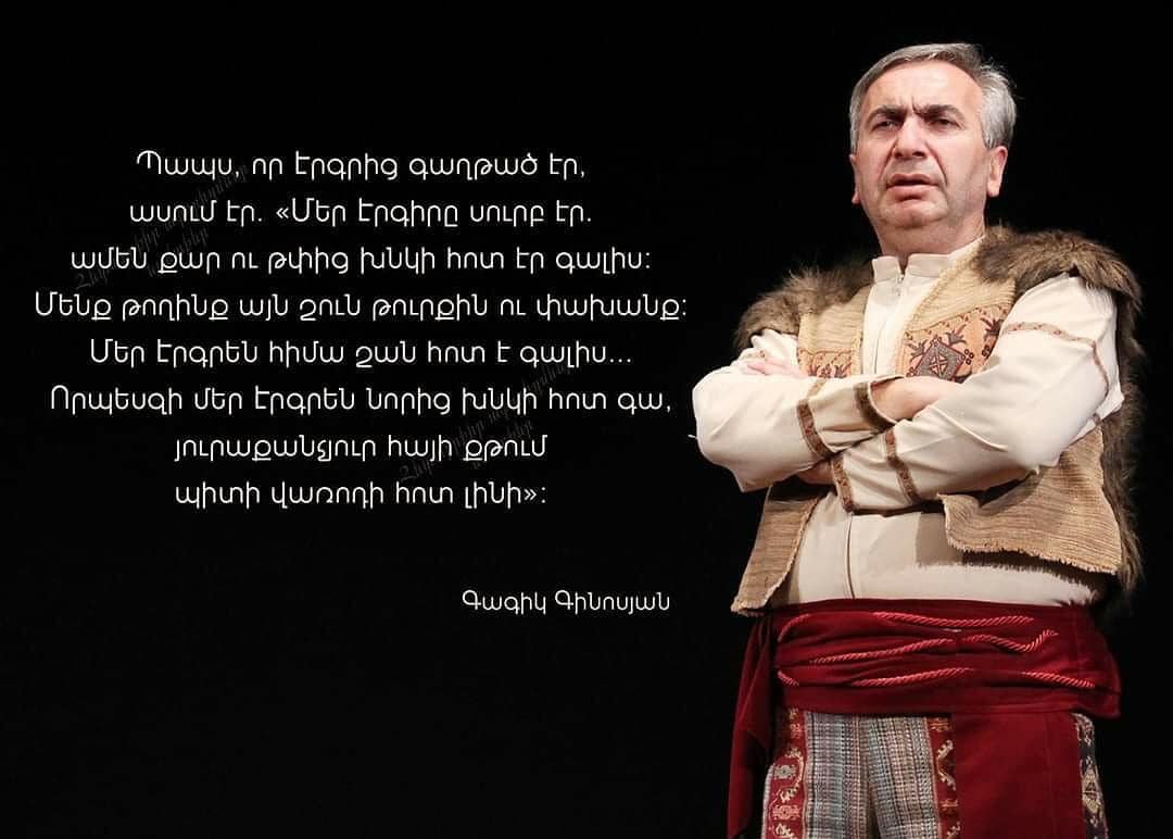 ՀԱՅԻ ՏԵՍԱԿԻ ԿՈՐՈՒՍՏ... Մահացել է «Կարին» ավանդական երգի-պարի խմբի հիմնադիր և գեղարվեստական ղեկավար, Հայաստանի մշակույթի վաստակավոր գործիչ և Արցախյան պատերազմի մասնակից Գագիկ Գինոսյանը։ Իր առաջին պարային գործունեությունը սկսել է իր հայրենի Ախալցխա քաղաքի հայկական դպրոցում՝ 1994թ. հիմնելով «Կարին» պարային համույթը։ ԱՀԵԿԿ-ի տնօրինությունն ու մանկավարժական կոլեկտիվը ցավակցում է բոլոր հարազատներին։ Ցավալի և դառը կորուստ...