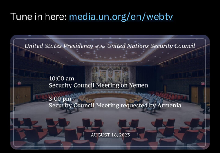 Председатель Совбеза ООН, Представительства США при ООН подтверждает, что сегодня в 23:00 по Тбилиси/Ереванскому времени по просьбе Армении состоится заседание Совета безопасности по вопросу горного Карабаха.